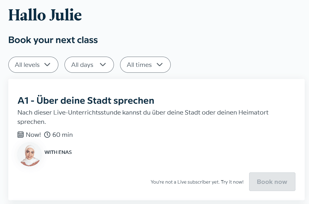 Firstly, real native speaker practice is available through a Babbel Live subscription. Babbel Live subscribers get unlimited group classes that are each an hour long.